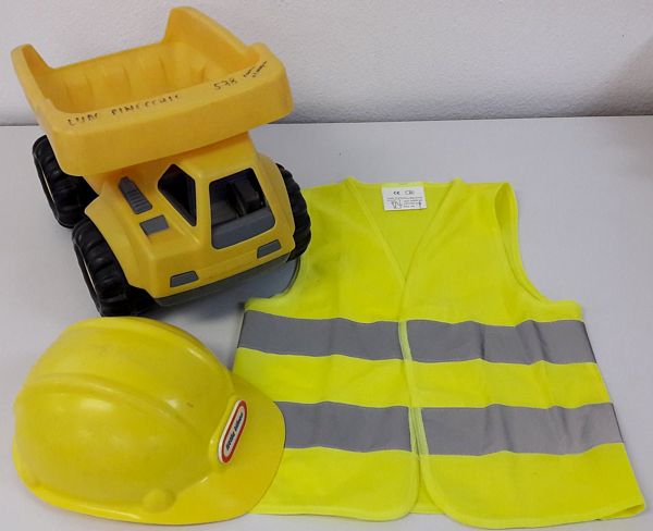 Camion benne, casque et gilet de chantier